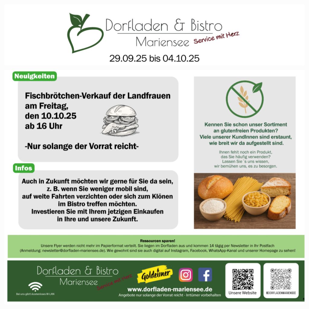 Nicht nur Wasser und politische Entscheidungen beschäftigen uns in diesen Tagen. Auch der Einzelhandel kämpft mit Herausforderungen. Immer wieder sind Sie/Wir Verbraucher mit unserem Konsumverhalten gefragt, zu helfen, Weichen zustellen. In diesem Sinne: Welches von Ihnren/Euren Lieblingsprodukten fehlen in unserem Sortiment? Vielleicht fehlt es anderen auch! Nur wenn wir’s wissen, können wir das ändern. Wir freuen uns über jede Rückmeldung. Das Team des Dorfladen Mariensee„Machen ist wie wollen, nur krasser.“