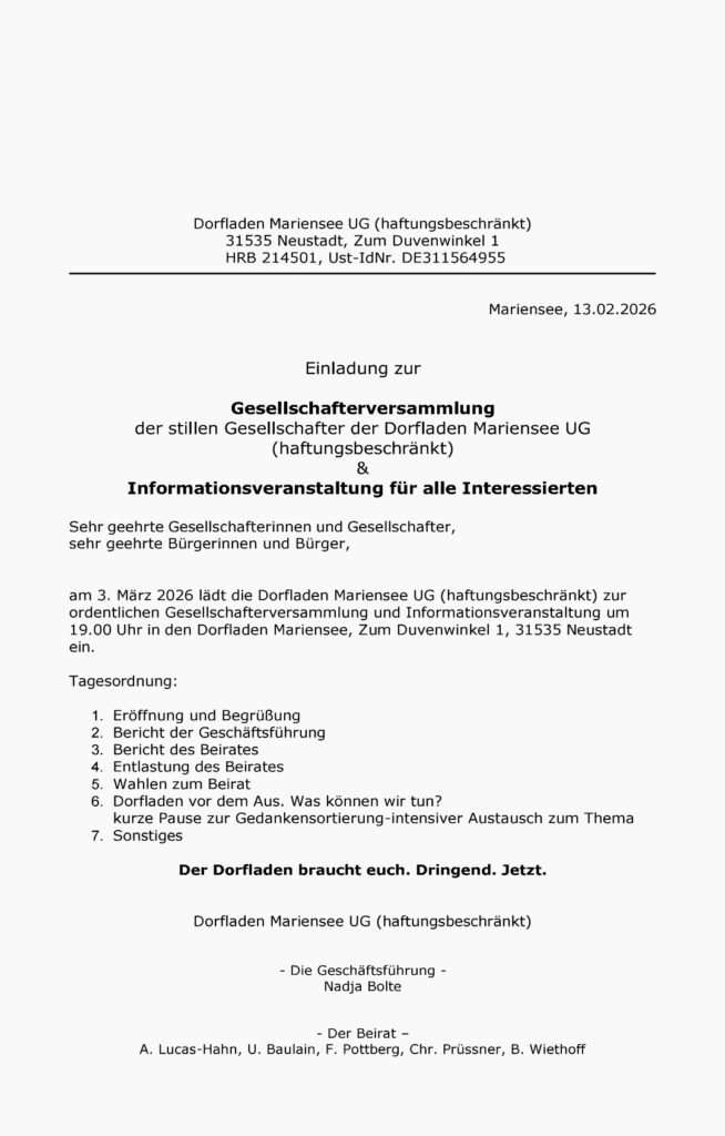 Melde dich unter unser-laden@gmx.de oder komm uns im Laden besuchen.Treffen des Freundeskreis Dorfladen Mariensee am kommenden Donnerstag den 14.11. ab 19:30 Uhr im Dorfladen.